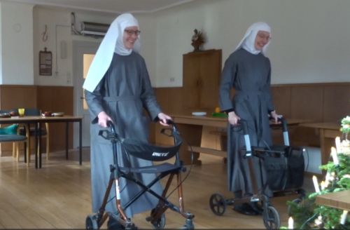In unserer Gemeinschaft werden die Professtage immer sehr festlich gestaltet. So werden verschiedene Orte im Haus geschmückt und es gibt meistens auch ein buntes Programm (kleine Theaterstücke, Gedichte, Tanz, Lieder…). Da unsere Sr. M. Lucia nicht nur der Selbe Jahrgang wie Papst Franziskus ist, sondern auch seine Leidenschaft für den Tango teil, haben unsere beiden Jüngsten zu Ehren unserer Jubilarin und zur Freude von uns allen einen Rollator-Tango aufgeführt der rasant und choreografisch ganz erstklassig war und bei dem die Rollatoren nur so flogen.