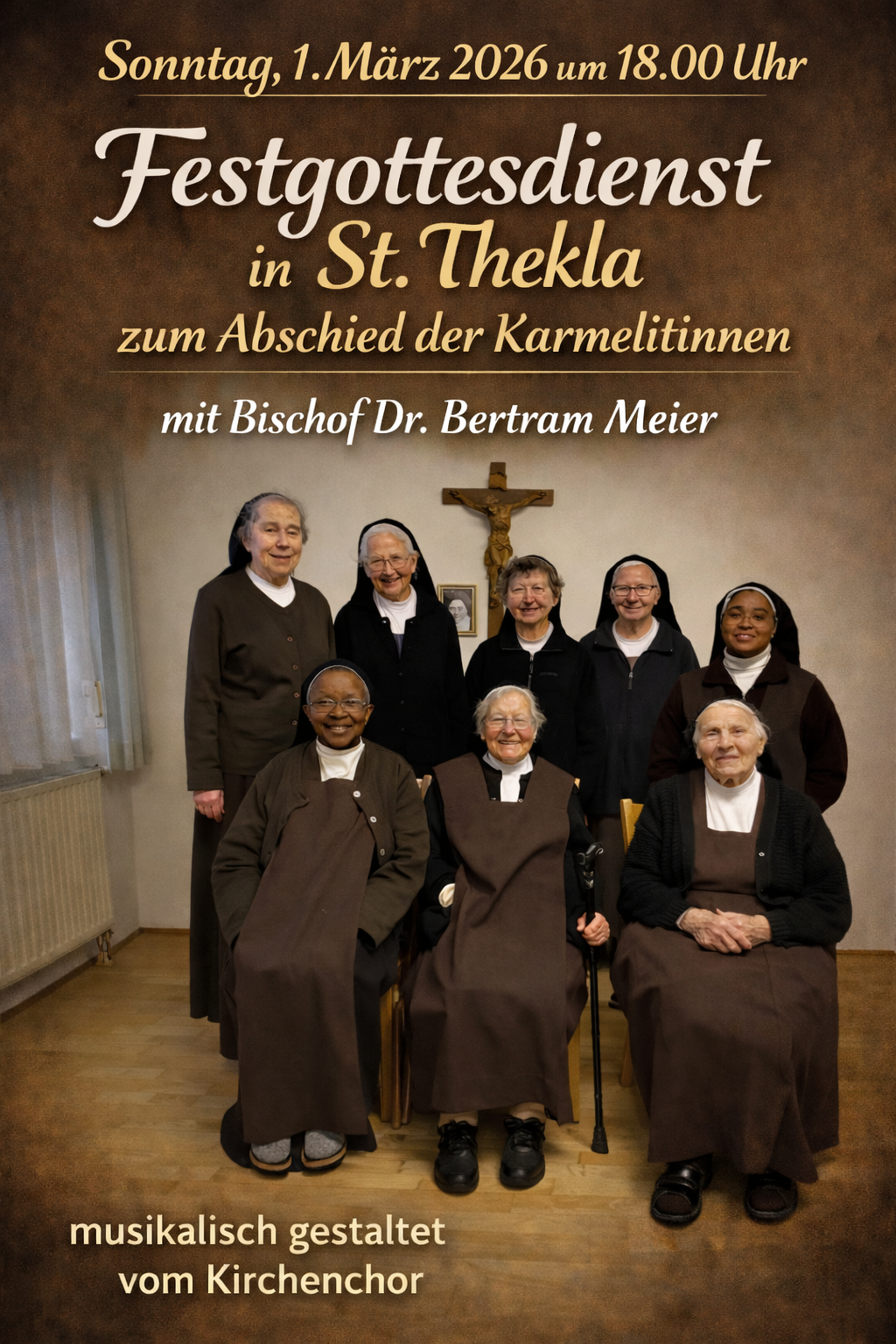 Am Sonntag, den 1. März 2026, findet in der Votivkirche St. Thekla in Welden ein feierlicher Abschiedsgottesdienst für unsere Mitschwestern aus dem Karmelitinenkloster Welden statt. Der Gottesdienst beginnt um 18.00 Uhr und wird von Bischof Dr. Bertram Meier zelebriert. Die musikalische Gestaltung übernimmt der Kirchenchor Welden. Alle sind herzlich eingeladen, an diesem besonderen Moment teilzunehmen.